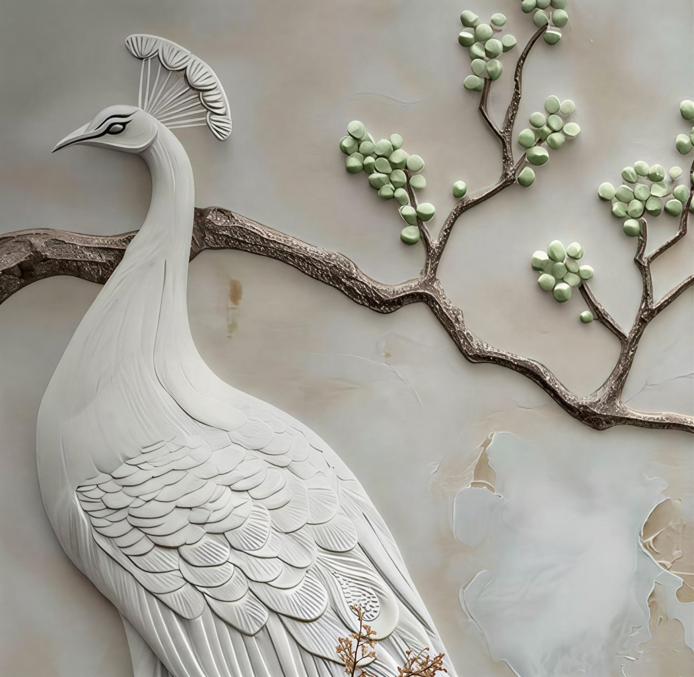 Transform your space with our Ivory 3D Peacock Serenity Wall Mural, a perfect blend of elegance and artistry. Featuring a beautifully sculpted white peacock against a soft, textured backdrop with subtle teal accents, this wallpaper creates a calming yet luxurious ambiance.