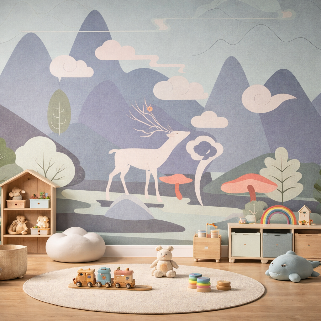 This design uses a beautiful palette of lavender, blue, and soft pink to create a calm and magical mountain scene. The clean lines of the trees and the whimsical deer give the mural a modern, storybook feel with a smooth, premium finish. It’s an ideal choice for creating a peaceful and quiet environment in a child’s bedroom or a nursery.