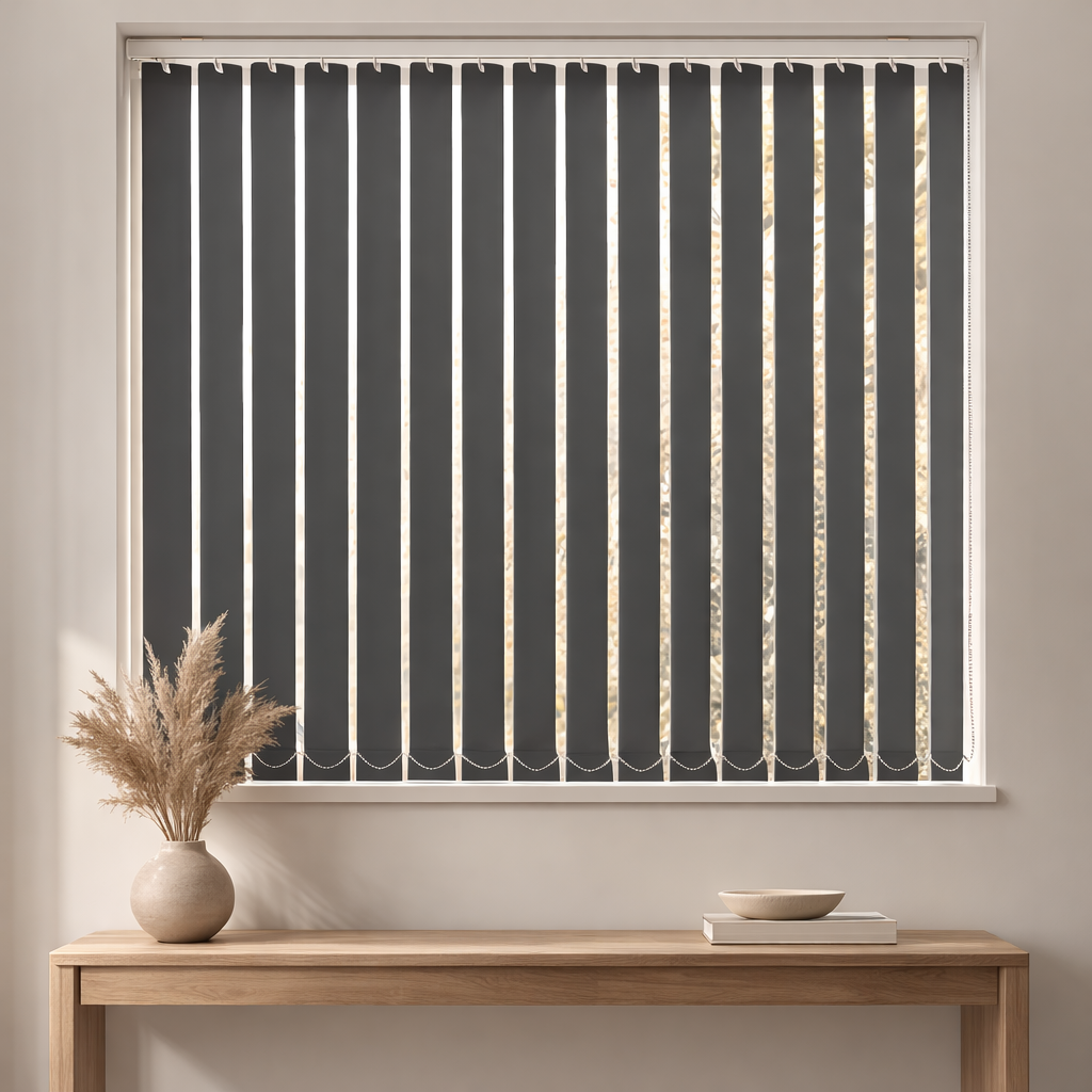 Modern vertical blinds in a deep charcoal grey that offer great light control and a sharp, clean look.